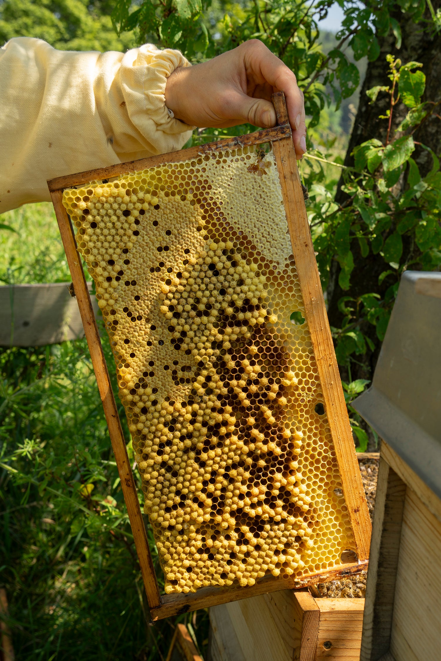 Wir leben eine Imkerei, die im Einklang mit der Natur steht. Unsere Bienen halten wir artgerecht, mit größter Sorgfalt und einem klaren Fokus auf ihr Wohl. Ein Beispiel: Damit unsere Bienen den Winter gut überstehen, achten wir darauf, dass sie möglichst von ihren eigenen Honigvorräten zehren können. Bei der Ernte im Frühsommer bewahren wir gezielt Waben voller Honig auf – ein Schatz, den die Bienen selbst geschaffen haben- damit unsere Bienen im Winter davon zehren können. Honig aus dem Allgäu ist weit mehr als Süße. Er ist reich an Nährstoffen, Enzymen und antibakteriellen Stoffen, die die Bienen kräftigen. Wir sind überzeugt: Bienen, die auch ihren eigenen Honig fressen, sind vitaler und widerstandsfähiger als solche, die nur mit Zuckerwasser ernährt werden.
